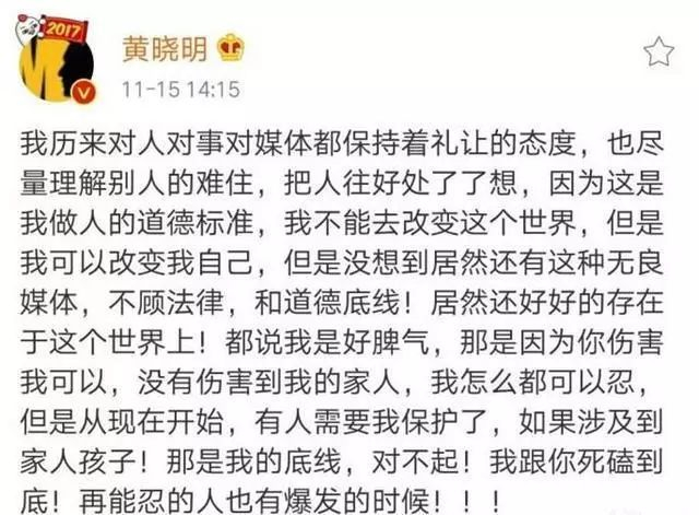 今年11月15日,港媒曝光了偷拍到的angelababy带孩子出行的照片,孩子“小海绵”正面照也被曝光。黄晓明看到此消息,当日下午愤怒地在微博炮轰港媒。毕竟当年闹的轰轰烈烈的白冰冰女儿被绑架之后,因为某些媒体不顾当事人和警方的劝阻而一味的过度,报道最终导致其女儿惨死的事件,现在想想依然后怕。