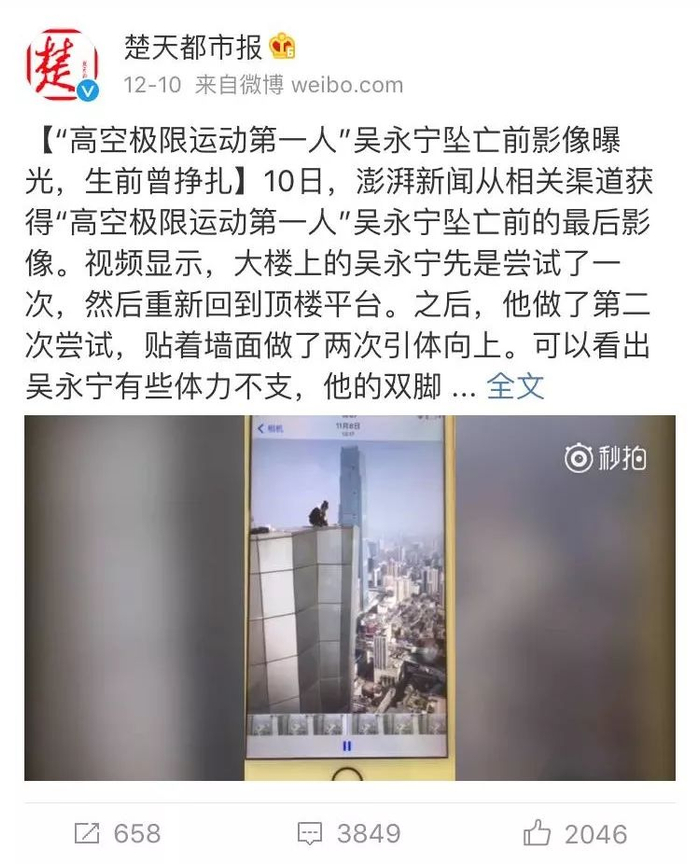 近日,有媒体曝光了高空挑战第一人吴永宁身前坠楼的视频。之后其未婚妻发文称,未经吴永宁家人许可就发布视频,没有考虑其家人的感受。