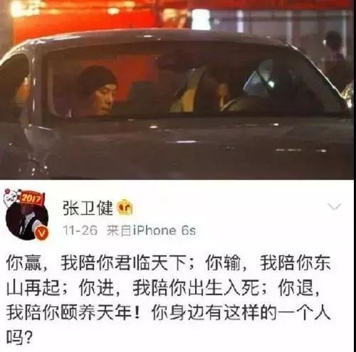 之前甩掉张卫健的那位女友,看到了不知作何感想。就像张卫健自己说的:你赢,我陪你君临天下;你输,我陪你东山再起。除了父母,又有几个人能做到?
