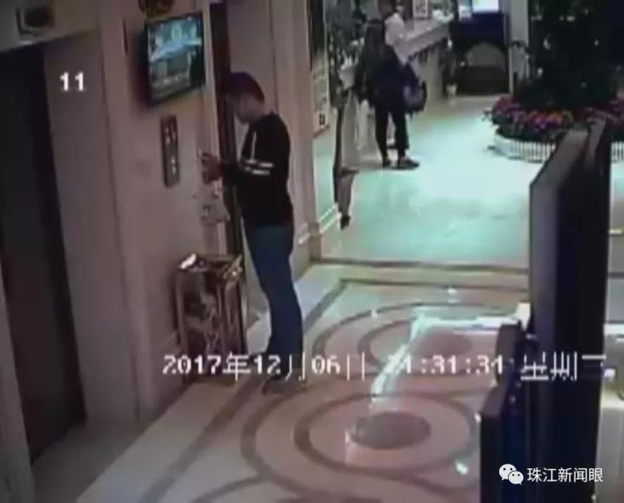 酒店的监控记录了案发的部分经过。事发在当晚的9点半左右,画面中身穿黑色上衣的就是涉事的外卖员。从行为上看,无论是在酒店大堂还是电梯间,这名外卖员在事前都没有表现任何的异常。