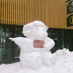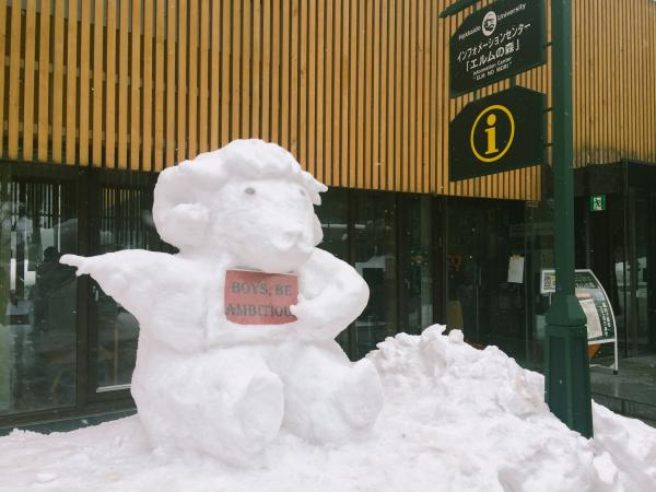 和同事们一起在场馆外堆的羊年雪人,BOYS BE AMBITIOUS是校训。本文图片除特别说明外均由作者提供。