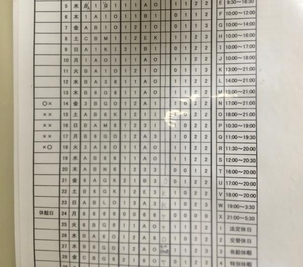 排班表根据出勤时段的不同分为A~X共24种排班形式。契约社员、打工者都有自己必须保证的一周出勤时间,在此之上可根据自己的时间安排选择排班形式。依照当日安排的值班时间,上司又会细分到每一个小时,为你安排满当当的工作。也许书店员这个职业在很多人看来是个非常文艺又体面的职种,但其实只要用三个字就能概括书店员的工作性质——体 力 活。毕竟书是一种重量级物品,而纸有时又是划开皮肉的利器。新书都是整箱整箱到,退换旧书也是整箱整箱运。整箱书搬上搬下,堆满整车的书运往不同的七个楼层,回想起来就觉得自己当时肌肉紧实了不少。