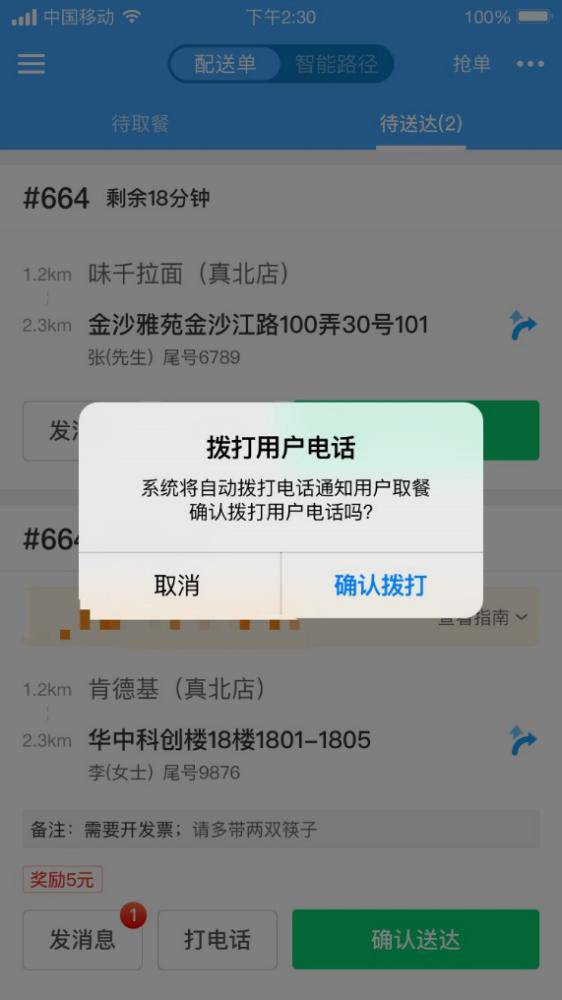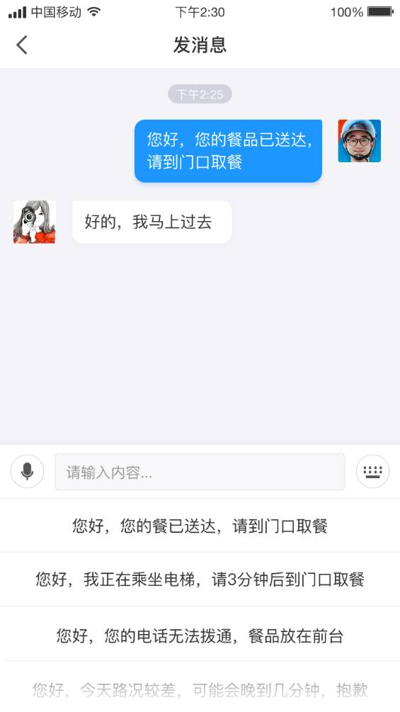 在骑手端的“蜂鸟配送”APP,新增的即时通讯工具还提供编辑常用语功能,供骑手一键发送文字与用户沟通。为防用户没有及时查收信息,APP还新增一键拨打用户电话按钮,骑手点击后,云端将自动拨打用户电话,用户接听后为提醒取餐的录音。