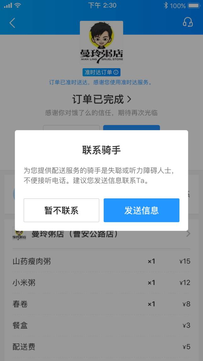 在用户端的“饿了么”APP,用户下单后,如接单骑手为失聪或听障人士,当用户点击致电骑手按钮,APP将弹窗提示配送骑手为失聪或听障人士,并建议用户使用内置即时通讯工具进行文字沟通。