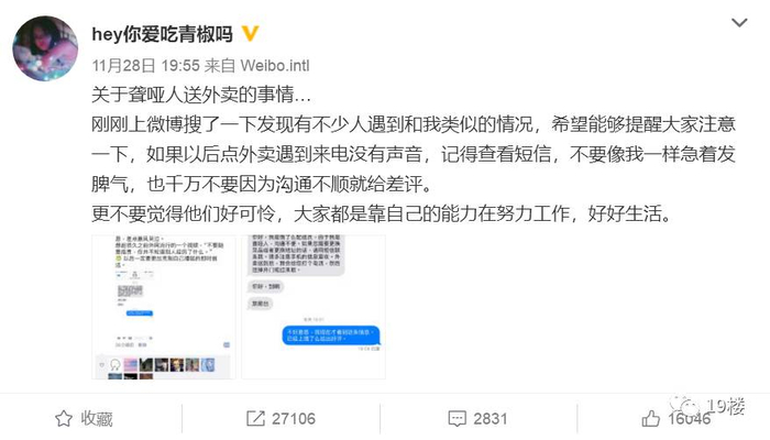 杭州网友@“hey你爱吃青椒吗”在微博上说了一件事情:点外卖之后接到几个没有声音的来电,都是一接通就挂断,当时以为是恶作剧,所以忍不住发了脾气,后来才发现外卖员的短信。原来外卖员是聋哑人,在短信里解释了沟通不便的苦衷,需要通过打电话来提醒顾客外卖已送到的讯息。