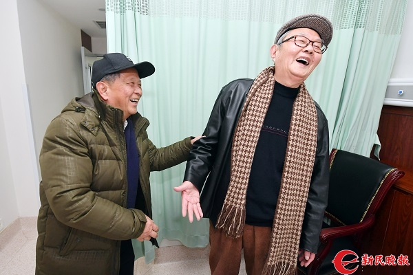 因一张“新民晚报”而重逢的两位老人,右为谢则林老人,左为孙医生。新民晚报记者 徐程 摄