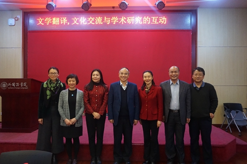 与会嘉宾合影留念(左起:对话嘉宾程小牧、段映红、宁琦,主讲人许钧,对话嘉宾申丹,主持人凌建侯,评议人杨国政)