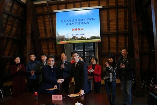 12月12日,同济大学交通运输工程学院与徐汇中学合作共建中学实训基地揭牌仪式在徐汇中学崇思楼举行。我校党委副书记姜富明,徐汇区区委常委、宣传部长吕晓慧,教育局局长庄小凤以及副局长于东航等领导参加了揭牌仪式。