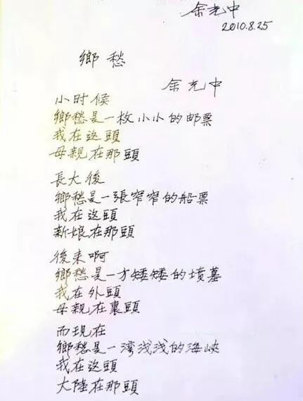 “小时候,乡愁是一枚小小的邮票,我在这头,母亲在那头;长大后,乡愁是一张窄窄的船票,我在这头,新娘在那头;后来啊,乡愁是一方矮矮的坟墓,我在外头,母亲在里头;而现在,乡愁是一湾浅浅的海峡,我在这头,大陆在那头。”