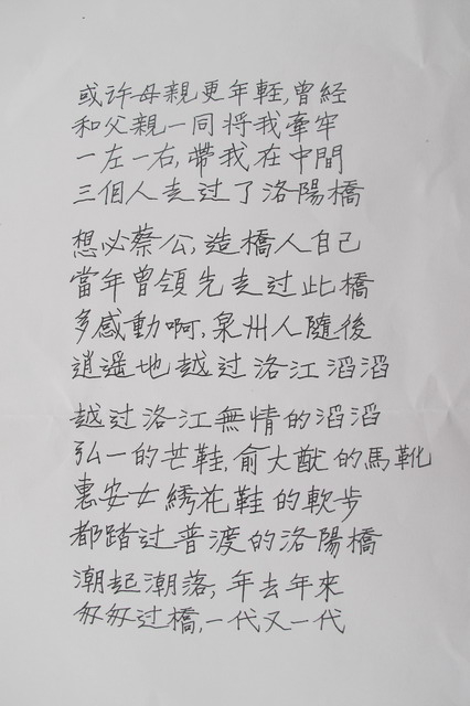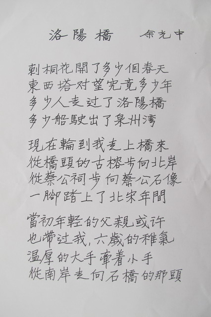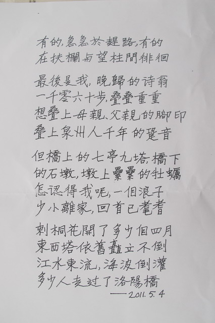 2011年来到泉州,余老说,自己想做的一件事,就是为故乡洛阳桥写诗。为此,他和妻子还专门到洛阳桥走了一遍。