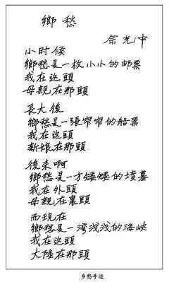 因为《乡愁》一诗被广大读者所认识的余光中在现代诗、现代散文、翻译、评论等文学领域都有涉猎,大学时期就读外文系的他,还没毕业就在文学刊物上投稿诗作,受到梁实秋赏识后出版诗集处女作《舟子的悲歌》。梁实秋曾赞他“右手写诗、左手写散文,成就之高、一时无两”。