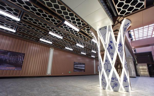在蟠龙路站,记者看到,站厅立柱以青花瓷为主要元素,辅以青浦“非遗”的传统版画。而天花板和隔板则以水波纹和鱼鳞纹的形式呈现,意在表现水乡意蕴。中厅顶部采用玻璃,形象美观,透光性好。