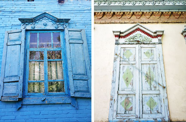 所有来到喀赞其的游客都会去拍蓝色的墙壁,更值得注意的是窗子、门廊和屋顶的设计,这里的窗子都是双层的,窗子上方有遮挡融雪的突出窗檐,玻璃窗外有一层木窗,还有一道斜向的木条,这是俄国人带来的颇为考究的御寒设计。