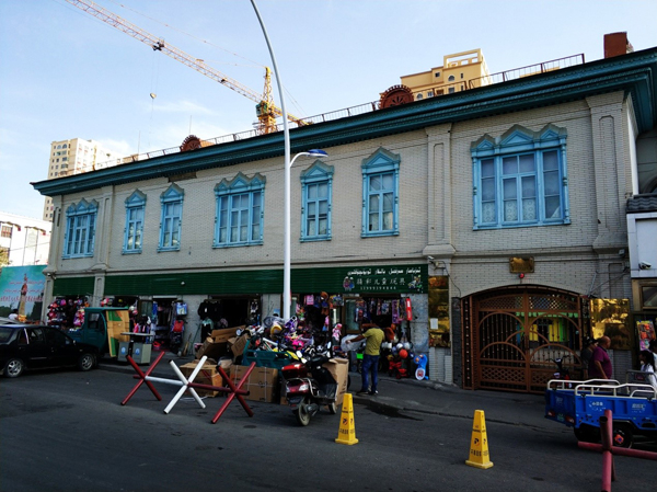 从伊犁宾馆出来沿着胜利北路往南,就能走到人民广场,转西一条街,在街口能看到一排白墙蓝窗蓝屋顶的房子。现在是小天使幼儿园,曾经这里是文丰泰商号,伊宁有一句俗语“汉人街没汉人”的典故就从这里开始。