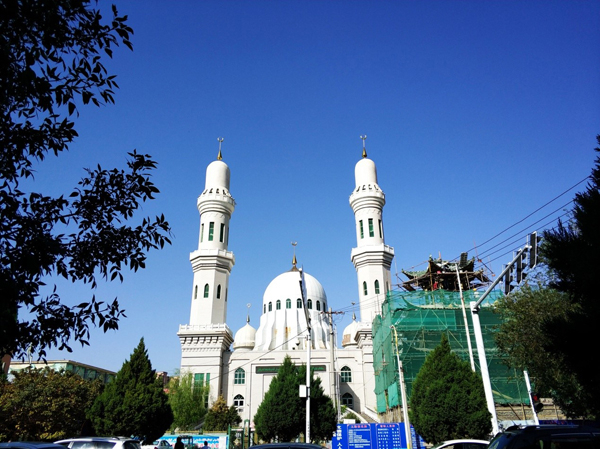 拜吐拉清真寺,白色建筑是新建的,右下角正在维护的中式宣礼塔才是老建筑。