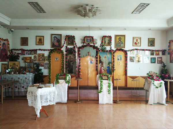 大概来了十几个人,彼得开始带领大家走进教堂正厅里,他们先是排队去教堂前面轮流点燃蜡烛插在烛台上,然后亲吻圣像。教堂的墙上挂着东正教圣像画,在一个角落有宗教仪式用的帽子、圣水和礼器,一张小桌子上摆着俄文的《圣经》和宗教书籍。