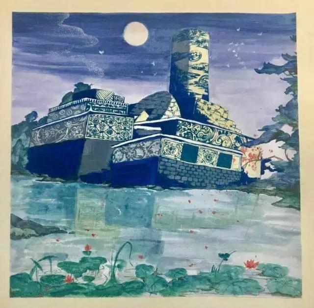 创作思路:以静谧的月夜为画面氛围,突出了紫金港多水的特点;同时以月牙楼、图书信息中心以及大西区的建筑为造型,辅之以传统图案常见纹饰,通过蓝白对比展现月光扑面映照在建筑物上的感觉。