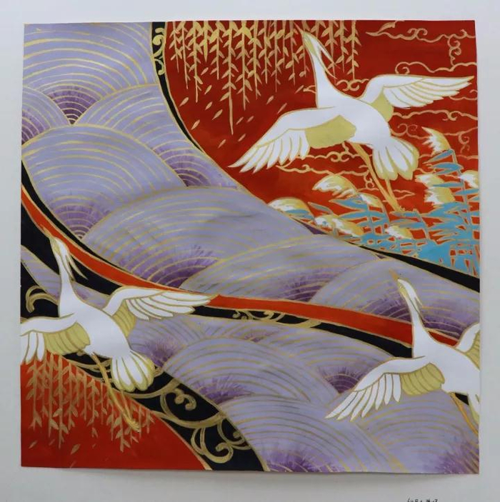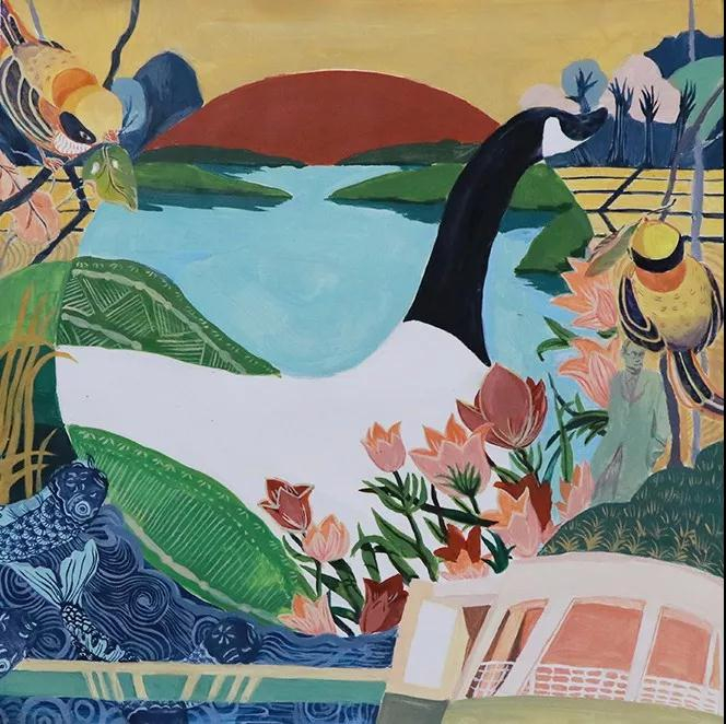 创作思路:整幅画以红黄蓝为主色调。左上角是启真湖的荷塘,以波纹为背景;左下角红色的桥是西区桥的印象;桥上是月牙楼前灯的印象;底部的水纹为西区桥上雕刻的花纹,同时也表现出紫金港水多的特性;仙鹤和鹦鹉一是表现紫金港古今交融的特点,二是表现了紫金港鸟禽之丰;中间的屋瓦层叠则是南华园和西区求是大讲堂的印象。意在表现紫金港的现代与古典,现实与梦幻。