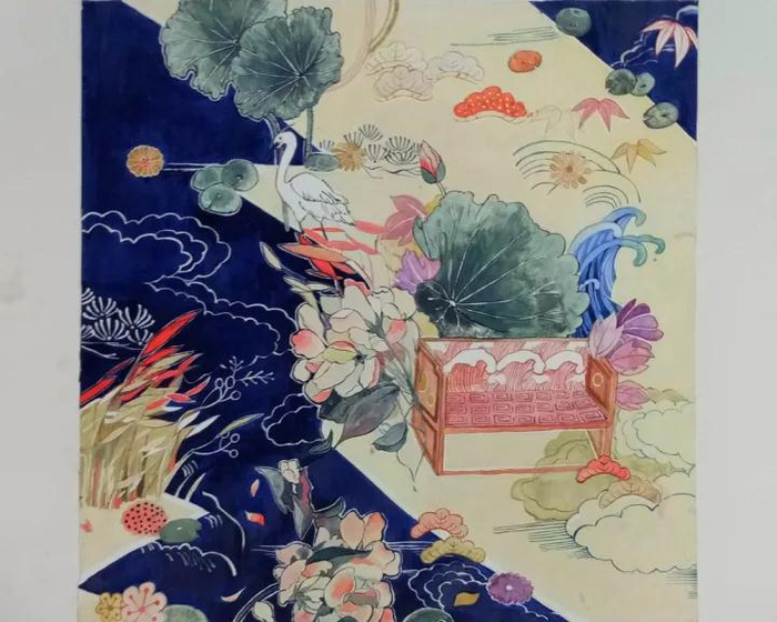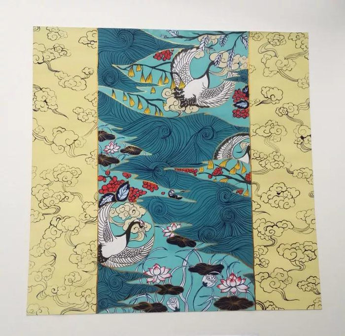创作思路:取材于校园中的银杏、莲花以及启真湖等意象,运用了水波纹、鹤纹和祥云纹进行创作。同时,鹤纹和祥云纹有吉祥的寓意,表达自己对学校的美好祝愿。