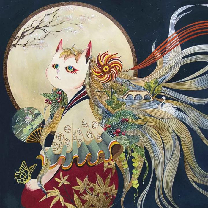 创作思路:以校园里萌萌的求是猫为主题。猫咪飘逸的长发其实是启真湖的物化,以校园里的植物点缀之,采用南华园作为背景,更具古典意味。配色上选用深蓝暗红和米色作为主色调,稳重大气,表达了紫金港的灵气、生气和书卷气。画面中猫的长发、服饰以及一些植物的造型都是由传统图案衍化而来。