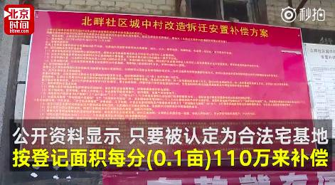 只要被认定为合法宅基地,就可按照登记面积领取补偿款。补偿价格为每分地(0.1亩)110万元。