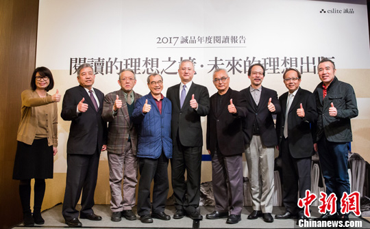 12月14日,诚品书店在台北发布2017年度阅读报告及阅读大调查。书店方面指,经营者对图书行业的理想并非实体书店永续之道;如何在碎片化时间里让读者进行完整的阅读,值得业者思考。图为诚品书店总经理李介修(左五)、副总经理林婉如(左一)与书店2017年合作出版社负责人合影。中新社记者 杨程晨 摄