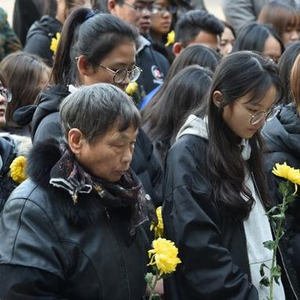 12月11日,大学生和市民在“侵华日军南京大屠杀草鞋峡遇难同胞纪念碑”前祭奠遇难同胞。新华社