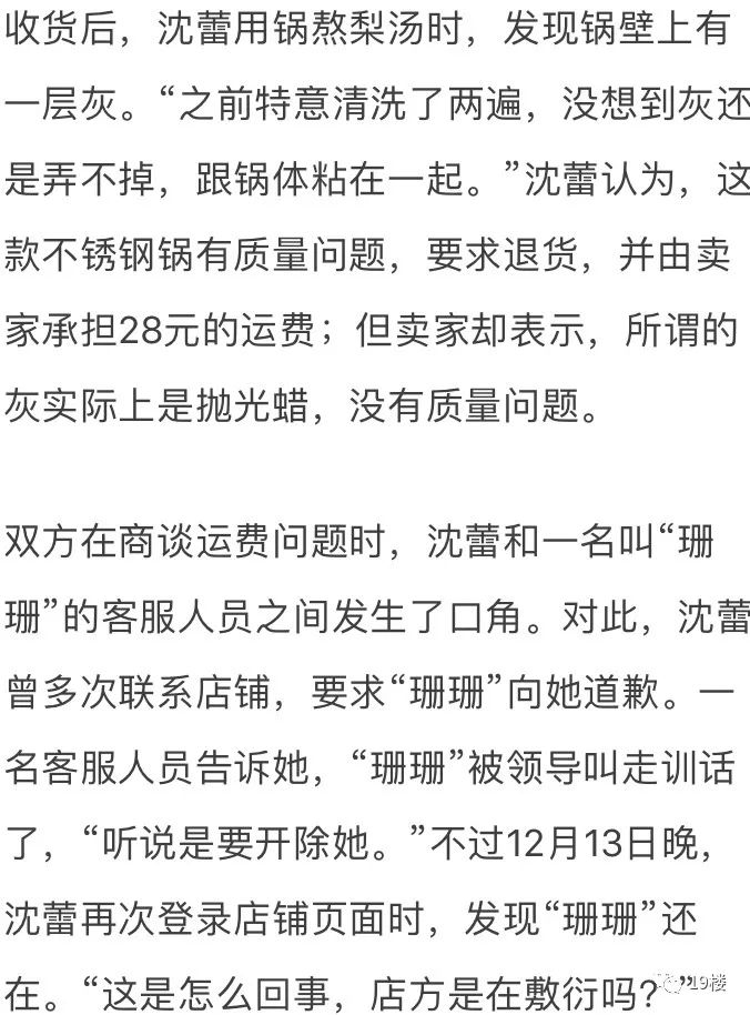 14日,记者电话联系了涉事网店,客服人员就此事进行了回应。客服人员说,这款不锈钢锅没有质量问题,如果消费者有异议,可以退货来解决。对于“珊珊”装鬼吓唬顾客一事,因“珊珊”已被开除,其中具体细节她暂时不清楚。她说,登录网店页面,现在的客服“珊珊”已经不是之前的人员,名字虽然一样,人已经换了。