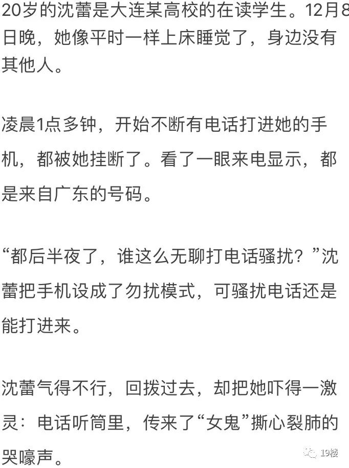 “任何听到我哭声的人,都会在睡梦中死去。”电话那头,传来了“女鬼”撕心裂肺的哭嚎声。睡得迷迷糊糊的沈蕾吓得一激灵,赶紧把电话挂了。她看了看表,凌晨1时40分。
