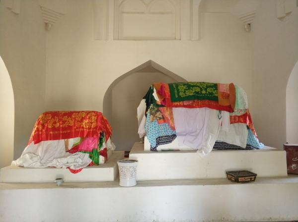 吐虎鲁克麻扎里面比较空阔,是一个完整拱形空间,四周是白色的墙壁,不太能看得出来之前是不是有彩色绘制。麻扎中间是吐虎鲁克的陵寝,陵寝上面盖着白色和彩色的丝织品和棉布,旁边还有一些芭兰香,布匹上有一些碎石和珠子,看起来还有人来朝拜祭祀。在大麻扎旁边还有一座小麻扎,没有彩色釉面,是完全的土墙,据说是吐虎鲁克妹妹的麻扎。