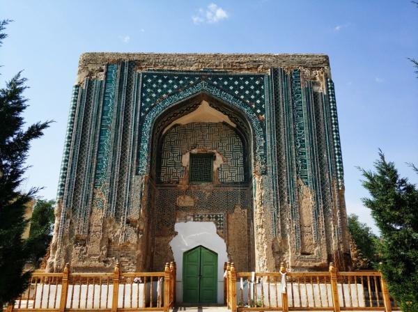 出租车行驶到一条小路上,我猛然发现远处有绿色的反光,让司机沿着村路开进去,终点就是东察合台汗国开国君主吐虎鲁克·铁木尔汗的陵墓。这座陵墓应该很少有人来参观,大门紧锁也没人看管,我拨打大门告示上的一个电话,过了一会儿一个女人来开门,收了四十块钱,给了我一串钥匙,让我自己进去参观。