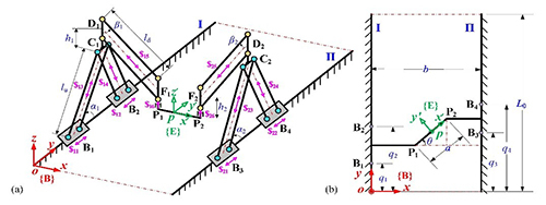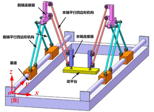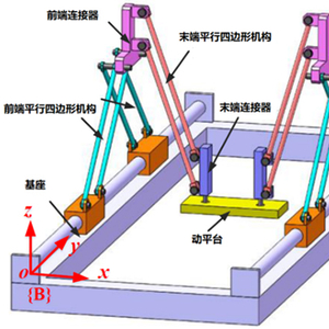 中国科学院宁波材料技术与工程研究所先进制造技术研究所精密运动与先进机器人团队最新设计的四自由度并联机器人,可以实现3T1R四个自由度的运动,是少自由度并联机器人的创新设计之一,其主要特点为2条相同支链通过被动转动副连接到动平台上,且每条支链有2个相同分支通过安装在基座上的移动副作为驱动。为进一步分析机构特点,采用螺旋理论验证了该机构自由度的数目及机构的运动学特性,得到了其位置的封闭解,根据机构的运动学特性和构型特点,该机构位置正解的封闭解最多有8组解,位置反解最多有4组解,结果表明,运动学分析简单是此并联机器人的特点之一。此外,具有构型对称、工作空间大、速度快且定位精度高的特点。相比于传统的并联机器人而言,它能够实现XYZ三个方向的运动与一个绕Z轴方向的转动,且在驱动方向工作空间可依作业需求扩展,增大了工作空间的范围。