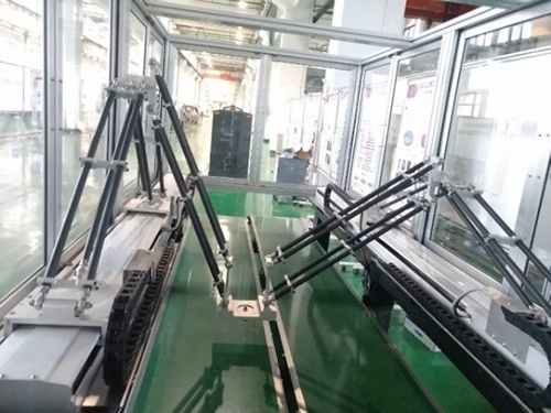 该并联机器人样机的每个支链采用了一定子两动子的高精度直线电机作为驱动机构,结构简单且电机定位精度达到微米级,此外,通过高强度的碳纤维复合材料作为支链的主要材料,有效降低了移动件的重量;控制系统采用了ABB的驱动器,通过PowerLink总线进行同步控制;通过基于运动学的离线轨迹规划算法,该机构的运动学目前该样机可达到XYZ三个方向的平动及绕Z轴方向的转动,移动范围分别是0.3m、1.2m和0.2m,其最大运动速度达到了1.6m/s,末端定位精度约为1mm,绕Z轴方向的转动可以达到±120°,能够广泛应用于柔性化工厂的包装、分拣等工序,具有很好的应用前景。