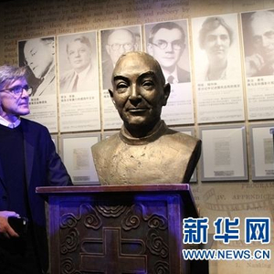 ↑2017年12月13日,克里斯・马吉与祖父约翰・马吉的铜像合影。新华网发(王珊宁 摄)