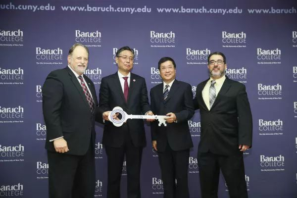 ▲12月6日,在纽约举行的巴鲁克国际金融孔子学院成立仪式上,中美双方校领导合影。这是在美国成立的首家以国际金融为主题的孔子学院。(王迎 摄)