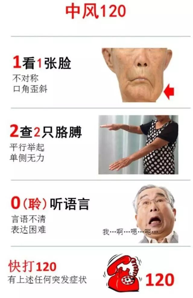在最佳卒中急救体系中,卒中发生5分钟内就要识别清楚,并尽快拨打120急救电话。中国卒中学会副会长、暨南大学附属第一医院副院长徐安定介绍,国际著名学术期刊《柳叶刀神经病学》已正式向全球发布这个“中风120”口诀。与小编一起学起来: