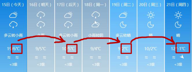 预报中明确:15—19日,滇中及以东以南地区最高气温将下降6~8℃,局地可达10~12℃。