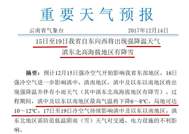 气温跌幅之大,让云南省气象台又一次发出了重要天气预报。