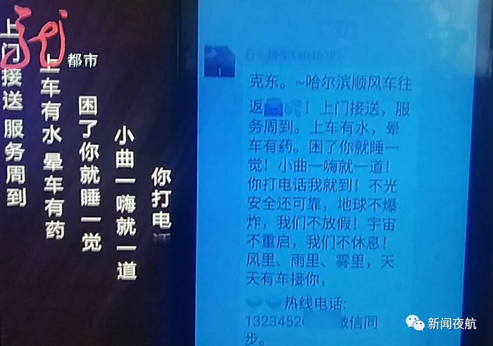 可能是因为争抢客源比较激烈,在这个群里有些车主把招揽乘客的广告写成了一段顺口溜:上门接送,服务周到,上车有水,晕车有药。困了你就睡一觉!小曲一嗨就一道!你打电话我就到!不光安全还可靠。