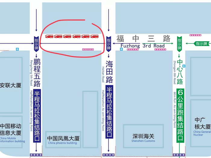 除了2号线、4号线外,3号线、11号线也可以到达赛事起点,大家可在市民中心、青少年宫、福田中的任意一站下车,然后步行前往起点,最好在7点前赶到赛场为好。