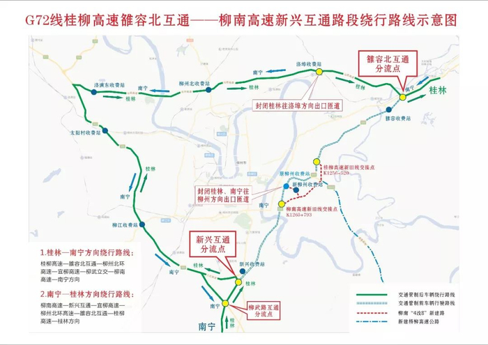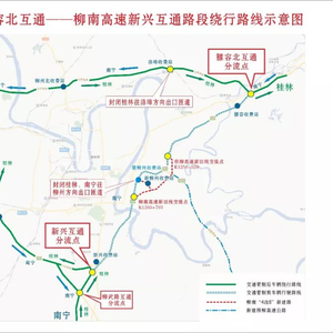 1、南宁往桂林方向行驶的车辆在G72泉南高速公路新兴互通实施分流,绕行宜柳、柳州北环高速公路后,进入G72泉南高速公路桂林至柳州段行驶。