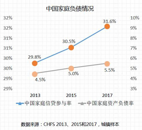 《报告》显示,中国城镇家庭资产负债率从2013年的4.5%增至2015年的5%,2017年再增至5.5%。
