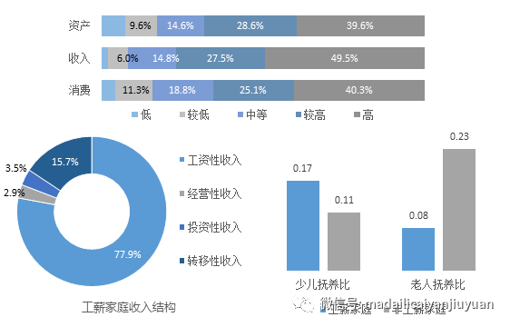 此外,从结构来看,八成以上工薪家庭的资产、收入和消费都处于中等及以上水平;其房产占总资产比重为78.2%,是家庭资产的主要组成部分;其工资性收入占比77.9%,是家庭收入的主要来源;其少儿抚养比为0.17,老人抚养比为0.08,少儿抚养负担相对较重。