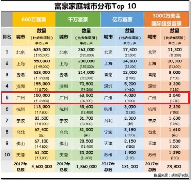 今年9月5日,胡润研究院发布《2017胡润财富报告》。截止到2017年1月1日,大中华区600万资产家庭数量已经达到460万。广州在富豪家庭城市分布中排名第5,广州每220人就有1人是千万富豪,仅次于北京、上海、香港与深圳。