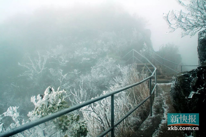 半山以上白茫茫的一片,冰雪将金子山冻住了,直接把金子山冻成冰美人。沿着登山径往上攀登可以看到,台阶上、竹林间、树枝上均积满了冰凌、冰花,溪流、瀑布、岩石上悬挂着许多冰挂。