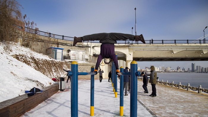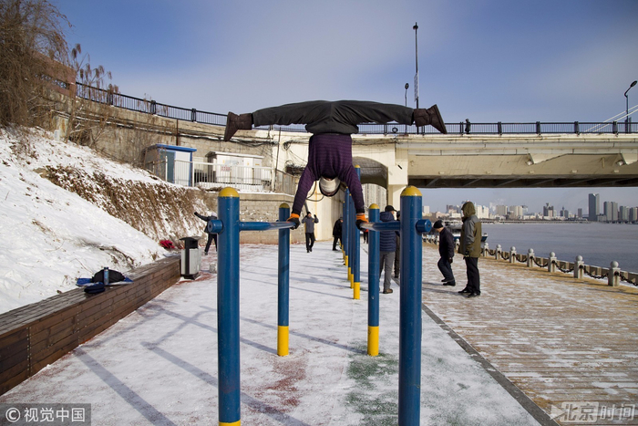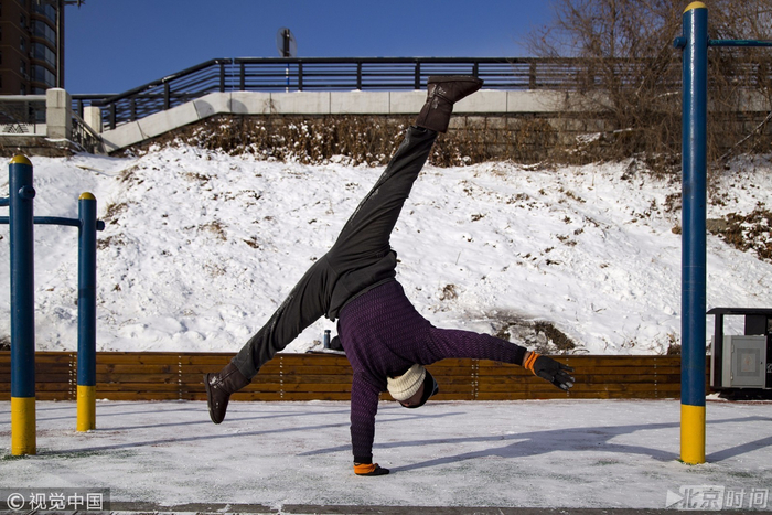 吉林市一位老人在松花江畔健身器材场地进行高难度的健身活动。这位老人的健身水平可不一般,不仅能单手空翻,还能在双杠上倒立,在一根杠上大劈叉,这一系列的高难动作让人啧啧称赞。