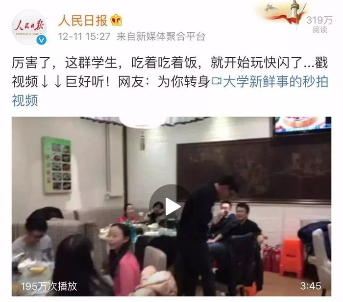 “当天晚上,我们学院的学生和老师一起聚餐,隔壁桌刚好有同学过生日,然后我们就唱了这首歌,顺便迎合下这个气氛。当时我们录了这个视频,没想到视频当晚就在微博上走红。