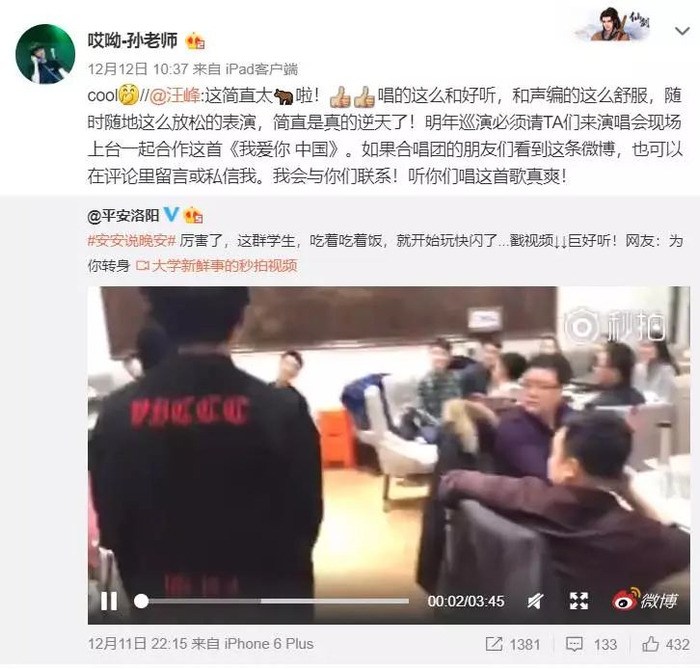 视频引起了这首摇滚风格《我爱你中国》的原唱汪峰的注意。
