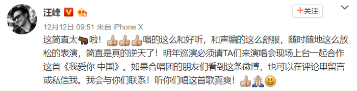 汪峰甚至在微博“求联系”,邀请同学们明年到他的演唱会现场合作《我爱你中国》!