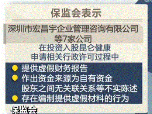 保监会表示,深圳市宏昌宇企业管理咨询有限公司等7家公司在投资入股昆仑健康、申请相关行政许可过程中,提供虚假财务报告,作出资金来源为自有资金、股东之间无关联关系等不实陈述,存在编制提供虚假材料的行为。保监会依据《行政许可法》等有关法律规定,撤销有关西藏恒实投资有限公司等3家公司增资入股昆仑健康的行政许可,清退违规取得的股权,并将相关投资人和中介机构列入市场准入黑名单。